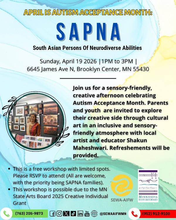 April is Autism Awareness and Acceptance month, and we will be hosting a sensory-friendly and creative space for adults and children to explore their creative sides through cultural art in a session led by local artist and educator, Shakun Maheshwari! Refreshments will be provided for this workshop. For any questions or concerns, please reach out to Shradha@sewa-aifw.org.